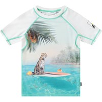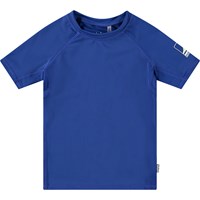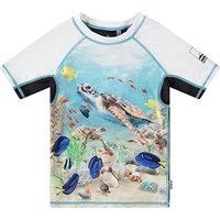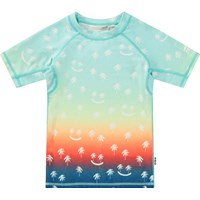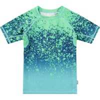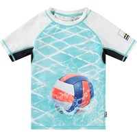 Zwemshirt voor actieve kinderen van gerecycled polyester met UV-bescherming van 50+. Het zwemshirt heeft een aansluitende pasvorm, een opstaande kraag en korte raglanmouwen. Het is comfortabel om te dragen dankzij het elastische materiaal. Het zwemshirt heeft een kleurrijke all over print van volleyballen. Het product is CE-gemarkeerd en getest volgens norm EN-13758-1.