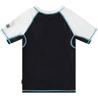 Witte zwemshirt voor actieve kinderen van gerecycled polyester met UV-bescherming van 50+. Het zwemshirt heeft een aansluitende pasvorm, een opstaande kraag en korte raglanmouwen. Het is comfortabel om te dragen dankzij het elastische materiaal. Het zwemshirt is wit met een print van een kleurrijk koraalrif met vissen en zeeschildpadden. Het product is CE-gemarkeerd en getest volgens norm EN-13758-1.