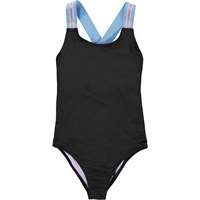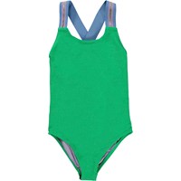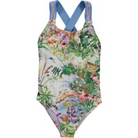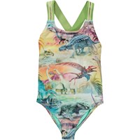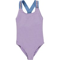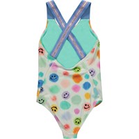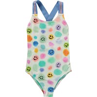 Badpak in een print van aquarelstippen in verschillende kleuren, waarbij sommige stippen emojis zijn. Het badpak heeft een ronde hals en brede, gestreepte, elastische bandjes, in blauw, paars en goud, die aan de achterkant kruisen als een v-vorm. Door de rekbare stof is het uiterst comfortabel en gemakkelijk aan en uit te trekken. Het biedt een hoog niveau van 50+ UV-bescherming tegen de zon. Het product is CE-gemarkeerd en getest volgens norm EN-13758-1.
