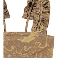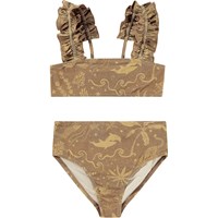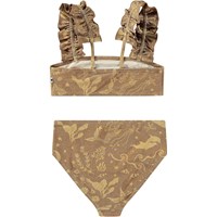 Elastische bikini gemaakt voor actieve kinderen met UV-bescherming 50+. De bikinitop is breed met ruches op de bandjes en is volledig gevoerd. De bikinibroek heeft een hoge taille met elastiek, een normale pasvorm en is ook volledig gevoerd. De bikini is in gouden bruine glitterkleuren en heeft een speelse print. Het product is CE-gemarkeerd en getest volgens norm EN-13758-1.