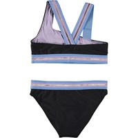 Zwarte asymmetrische sportieve bikini met brede, elastische schouderbandjes in paars en goud die op de rug kruisen. Het broekje heeft een normale pasvorm met hetzelfde brede elastiek in de taille. Molo's zwemkleding heeft een hoge 50+ UV-bescherming.