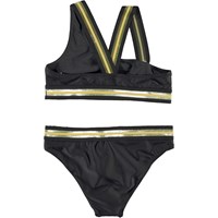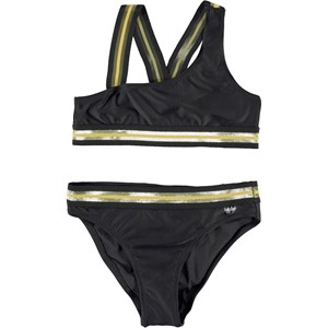 Nicola is een asymmetrische bikini in het zwart. Het heeft brede gestreepte banden en een boord in goud. Het bovenstukje heeft gekruiste bandjes op de rug. De zwemkleding van Molo heeft een UV berscherming van 50+.