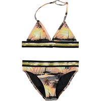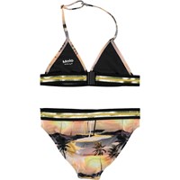 Nicoletta is een halter triangel bikini met een print van palmbomen en een zonsondergang. Het heeft een gouden boord met strepen. De zwemkleding van Molo heeft een UV berscherming van 50+. Het product is CE-gemarkeerd en getest volgens norm EN-13758-1.