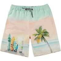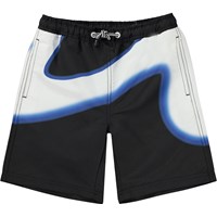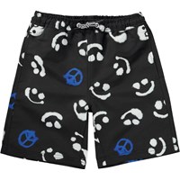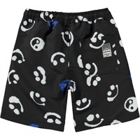 Zwarte zwemshort met een blauwe en witte print van verschillende Emoji's, Yin Yang symbolen en peace tekens. Het is van 100% polyester en heeft lange pijpen. De zwemshort heeft een elastische taille met koordjes, zijzakken en een achterzak met een witte Molo Swim-logo. De zwemshort heeft een ruimvallende pasvorm. Molo's zwemkleding heeft 50+ UV-bescherming. Het product is CE-gemarkeerd en getest volgens norm EN-13758-1.