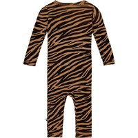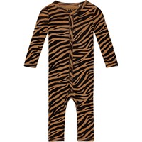 Zwart en oranje babypakje van biologische merinowol in zebrastrepen met lange mouwen, lange pijpen en knopen aan de voorkant.