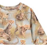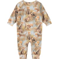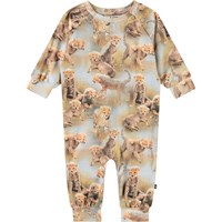 Babypakje van zacht biologisch katoen. Het babypakje heeft lange mouwen en pijpen en drukknopen op één schouder en langs de pijpen, waardoor het gemakkelijk is aan en uit te trekken. Het is ruimvallend met ribboorden rond de mouwen en pijpen, waardoor het comfortabel is om te dragen en veel bewegingsvrijheid biedt. Het babypakje heeft een print van schattige cheetawelpen.
