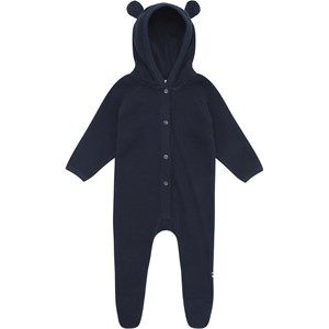 Faith is een donkerblauwe babypakje met drukknopen aan de voorkant en een capuchon met kleine opgenaaide oren. Houd er rekening mee dat de maten 56-74 voeten hebben en de maten 80-92 niet.