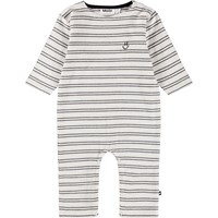 Gestreepte babypakjevan biologisch katoen in verschillende kleuren met een wit geborduurd lachend gezicht op de borst. Het babypakje heeft lange mouwen en pijpen en drukknoopjes op de schouder en tussen de benen om het gemakkelijk aan en uit te trekken.