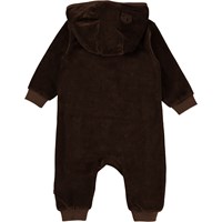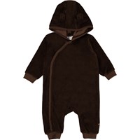 Forest is een donkerbruine fluwelen babypakje met op de voorkant een schuine knoopsluiting. Het heeft een capuchon met smalle opgenaaide oortjes.