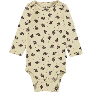 Foss is een lichtgele rompertje met een print van kleine eekhoorntjes en nootjes. Foss heeft drukknopen op de schouder en in het kruis.