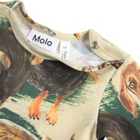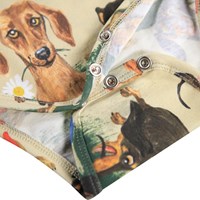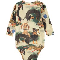 Beige rompertje voor de kleintjes gemaakt van biologisch katoen met lange mouwen en een print van teckels. Het rompertje heeft een biaisboord en drukknopen op de schouders en in het kruis voor het gemakkelijk aan- en uitkleden.