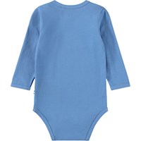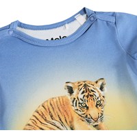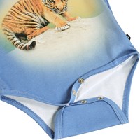 Blauw, lang mouwloos rompertje voor de kleintjes gemaakt van biologisch katoen met een tijgerprint. Het rompertje heeft biezen en drukknoopjes op de schouders en tussen de benen voor gemakkelijk aan- en uitkleden.