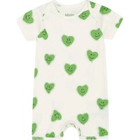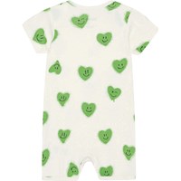 Gebroken witte babypakje van biologisch katoen met een print van groene lachende hartjes. Het heeft korte mouwen en pijpen, waardoor het perfect is voor warme zomerdagen. Het babypakje heeft drukknopen op de schouder en in het kruis. Het heeft een comfortabele ruimvallende pasvorm. Het heeft een ronde hals zaodat het makkelijk is aan te trekken.