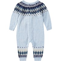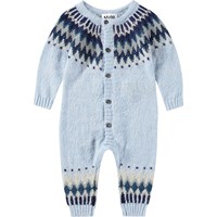 Lichtblauwe babypakje van zachte alpacawolmix. Het babypakje heeft lange mouwen, lange pijpen en knoopsluiting aan de voorkant. Het heeft een prachtig Noords geïnspireerd patroon rond de kraag en de pijpen. Perfect voor koude dagen.