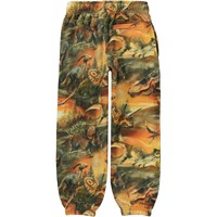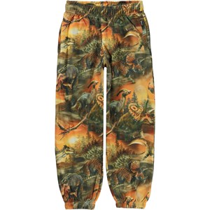 Groene en oranje joggingbroek met een print van verschillende dinosaurussen die in de schemering in de zandduinen ronddwalen. Er is een omtrek van een maan boven hen die hen eraan herinnert dat ze deel uitmaken van iets groters. Deze joggingbroek is van 100% katoen. Het heeft elastiek en een koordje in de taille en elastiek bij de pijpen. Het heeft zakken aan de zij- en achterkant en het heeft een normale pasvorm.