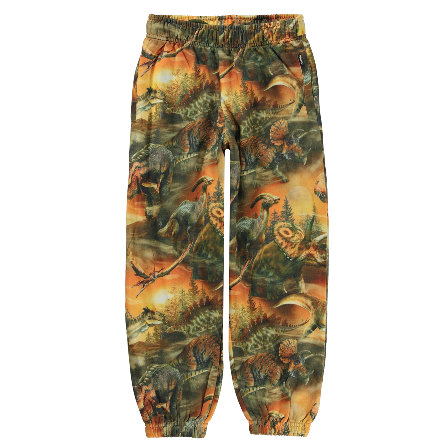 Groene en oranje joggingbroek met een print van verschillende dinosaurussen die in de schemering in de zandduinen ronddwalen. Er is een omtrek van een maan boven hen die hen eraan herinnert dat ze deel uitmaken van iets groters. Deze joggingbroek is van 100% katoen. Het heeft elastiek en een koordje in de taille en elastiek bij de pijpen. Het heeft zakken aan de zij- en achterkant en het heeft een normale pasvorm.