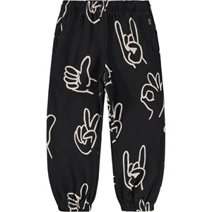 Zwarte joggingbroek gemaakt van biologisch katoen met een elastische taille, trekkoord aan de binnenkant, elastiek rond de enkels en zijzakken. De joggingbroek heeft een normale pasvorm en een witte print van verschillende handgebaren.
