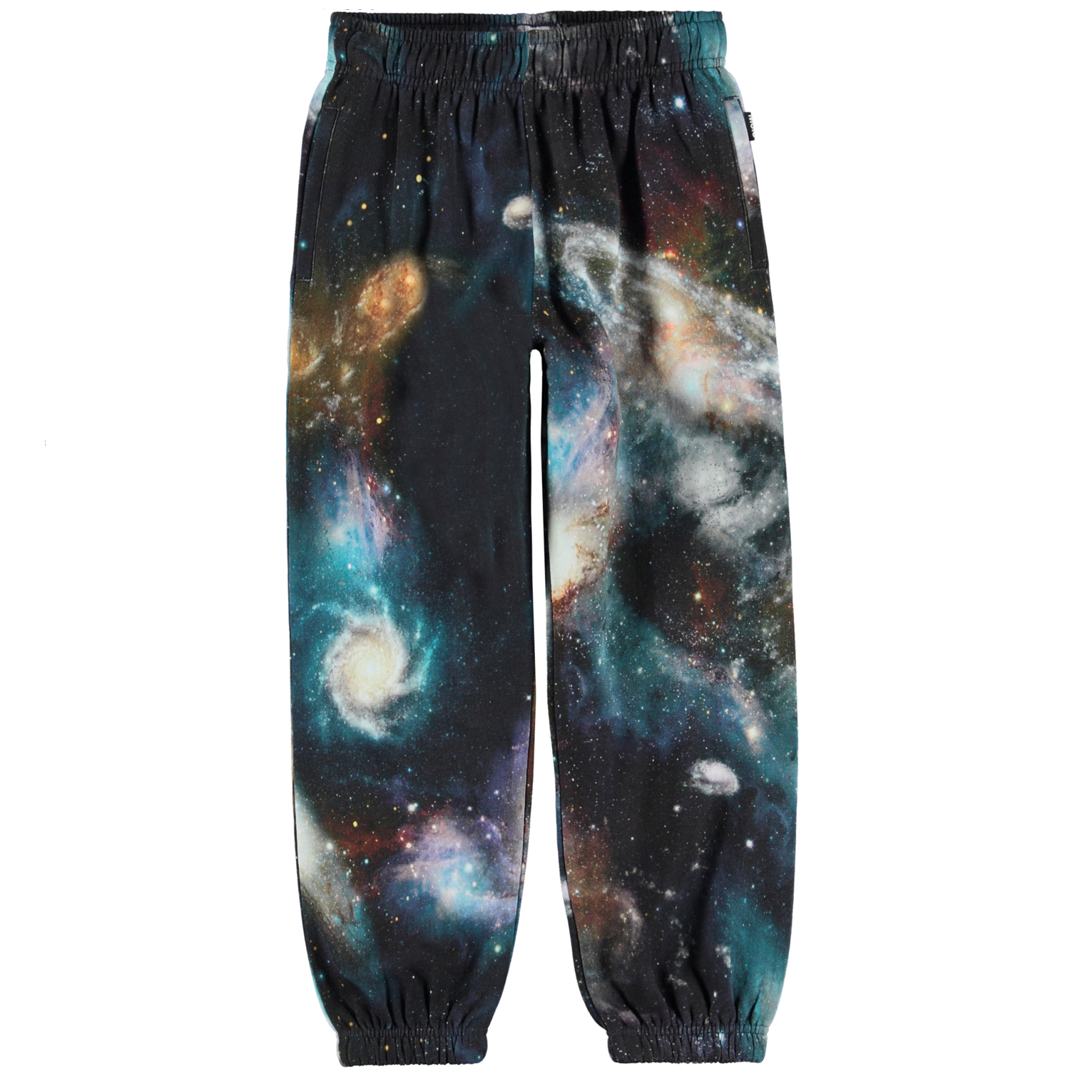 Adan is een unisex joggingbroek met een print van het heelal. Het heeft een elastische boord rond de pijpen en taille en ook voorzakken en een achterzak.