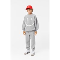 Grijze gemêleerde joggingbroek van biologisch katoen met een gevoerde binnenkant, waardoor het zacht en warm is om te dragen. De broek heeft een normale pasvorm, een elastische taille met koordje, elastiek rond de enkels en zijzakken. Het heeft een een witte grafische tekstprint met de tekst "You Me Togetherness", geprint op de voorkant van een bovenbeen