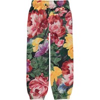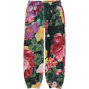 Groene joggingbroek met grote bloemenprint in de kleuren roze en geel. De print is gemaakt van prachtige levendige bloemen, en als je goed kijkt, zie je de penseelstreken. Deze joggingbroek is van 100% katoen. Het heeft elastiek en een koordje in de taille en elastiek bij de pijpen. het heeft zakken aan de zij- en achterkant en het heeft een normale pasvorm.