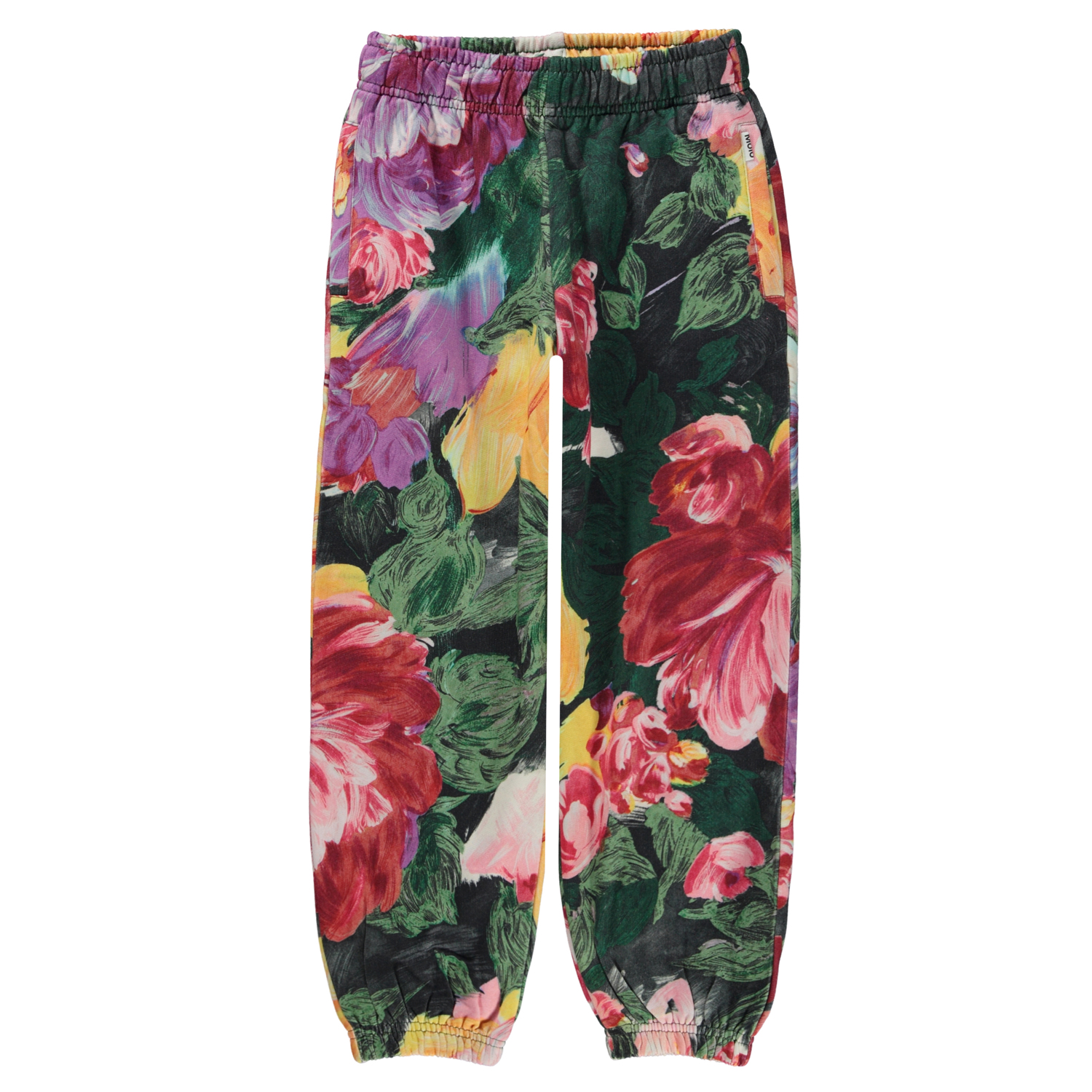 Groene joggingbroek met grote bloemenprint in de kleuren roze en geel. De print is gemaakt van prachtige levendige bloemen, en als je goed kijkt, zie je de penseelstreken. Deze joggingbroek is van 100% katoen. Het heeft elastiek en een koordje in de taille en elastiek bij de pijpen. het heeft zakken aan de zij- en achterkant en het heeft een normale pasvorm.