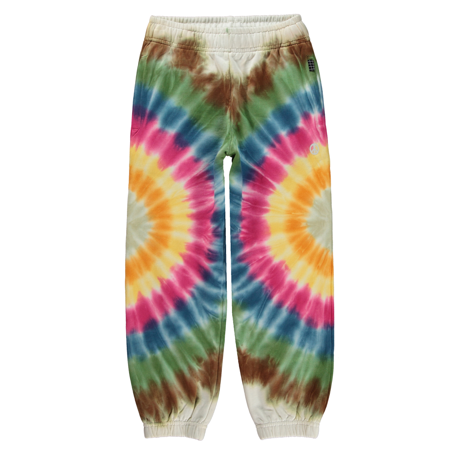 Witte joggingbroek met veelkleurige cirkelvormige tie-dye print. Deze joggingbroek is van 100% katoen. Het heeft elastiek en een koordje in de taille en elastiek bij de pijpen. het heeft zakken aan de zij- en achterkant en het heeft een normale pasvorm. De tie-dye print van Molo is uniek en met de hand gemaakt, wat betekent dat de print van stijl tot stijl kan verschillen.