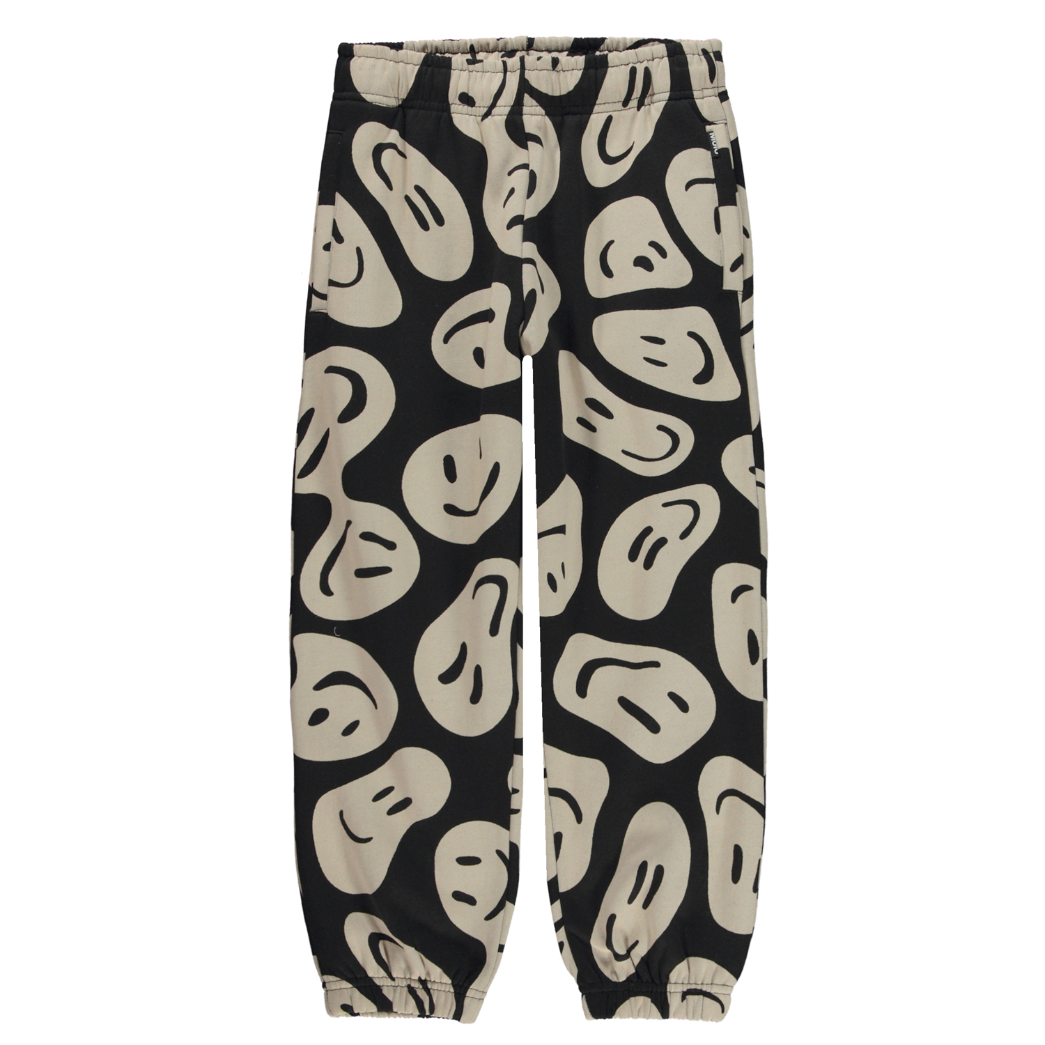 Zwarte joggingbroek in een print van een heleboel blije smiley’s die rondzweven en worden uitgerekt en hervormd. Deze joggingbroek is van 100% katoen en heeft een elastiek en een koordje aan de binnenkant van de taille. Het heeft elastiek bij de pijpen, steekzakken en een achterzak. De joggingbroek heeft een normale pasvorm. Voor een perfecte set draag je het met de bijpassende Monti sweater die dezelfde print heeft.
