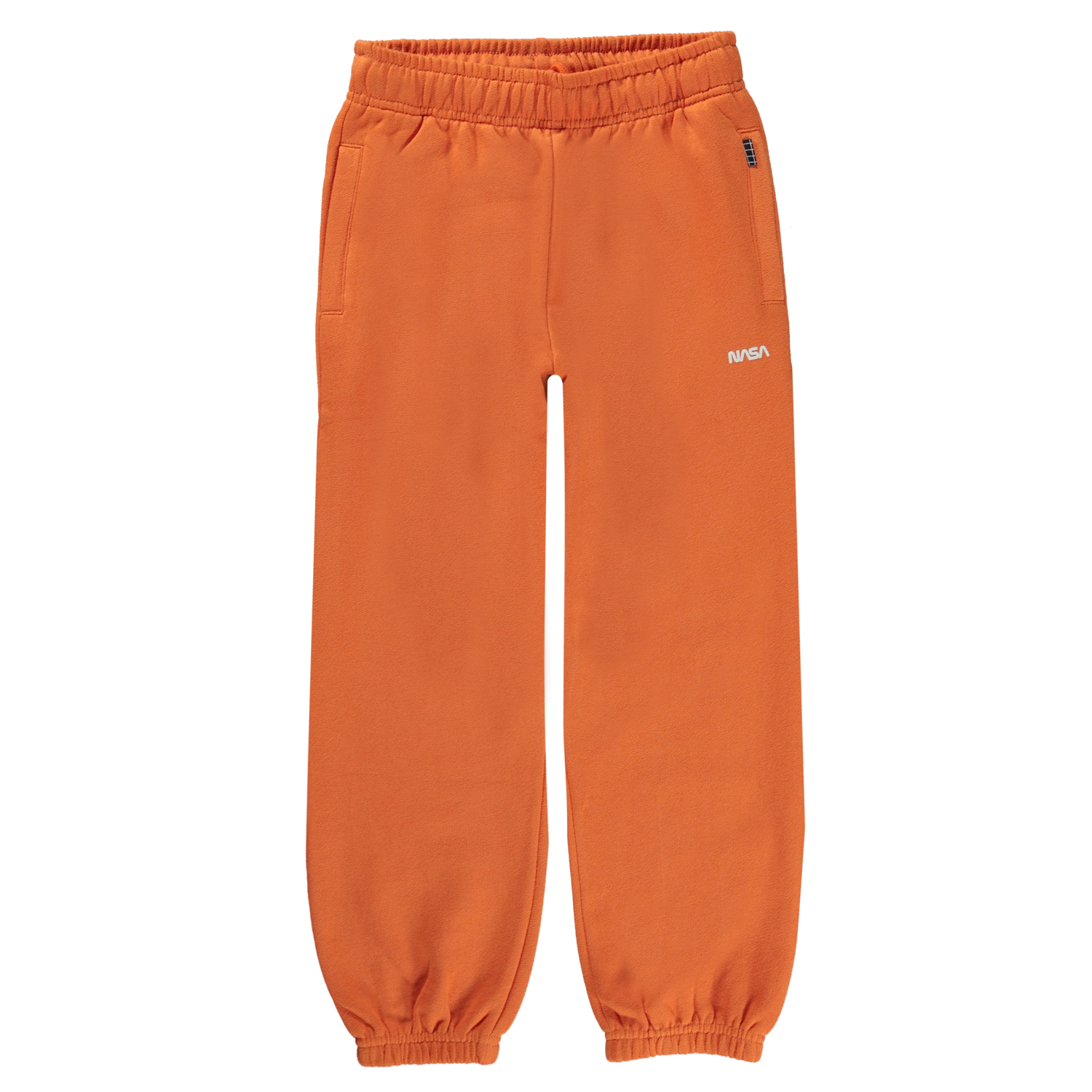 Oranje joggingbroek met op de voorkant in het wit gedrukt een NASA logo. het is van 100% katoen, heeft een elastische taille met koordjes, elastiek aan de pijpen, zijzakken en een achterzak. Het heeft een normale pasvorm. Voor de perfecte set draag je het met de Moz hoodie of het Roxo t-shirt die dezelfde kleur heeft.