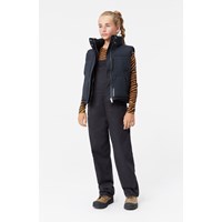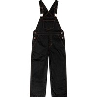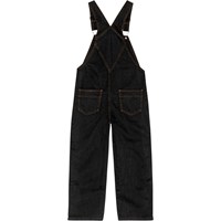 Zwarte tuinbroek met koperkleurige stiksels. De broek heeft verstelbare bretels, een klein voorvak op de borst en zakken aan de zijkanten en achterkant. Er zijn knopen aan de zijkanten, waardoor het gemakkelijk aan te trekken is. De broek heeft een normale pasvorm.