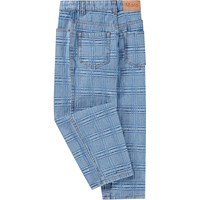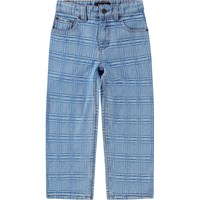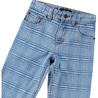 Blauwe jeans van biologisch katoen geweven in een blokjespatroon. De jeans heeft 5 zakken, rechte pijpen en een ritsgulp. Geïnspireerd door de skateboardscene heeft deze broek een ruimvallendepasvorm.De tailleband van de jeans kan worden aangepast met een interne elastiek, waardoor een perfecte pasvorm voor alle kinderen wordt gegarandeerd. Maten 92-134 hebben een drukknoop, waardoor de broek gemakkelijk aan en uit te trekken is, terwijl maten 140-176 een normale jeansknoop hebben.