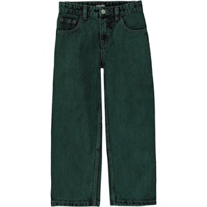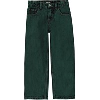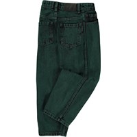 Donkergroene jeans in een zwart/groen gemêleerd effect. Het is van 100% katoen met lange pijpen. De jeans heeft een ruimvallende pasvorm. De tailleband kan worden aangepast door middel van een elastiek aan de binnenkant, zodat de jeans perfect past bij alle kinderen. De maten 92-134 hebben een drukknoop, terwijl de maten 140-176 een gewone jeansknoop hebben. Het grootste deel van dit model is gemaakt van biologisch katoen.