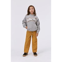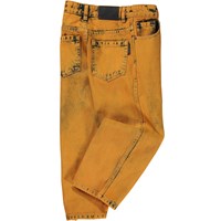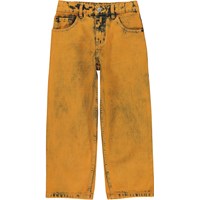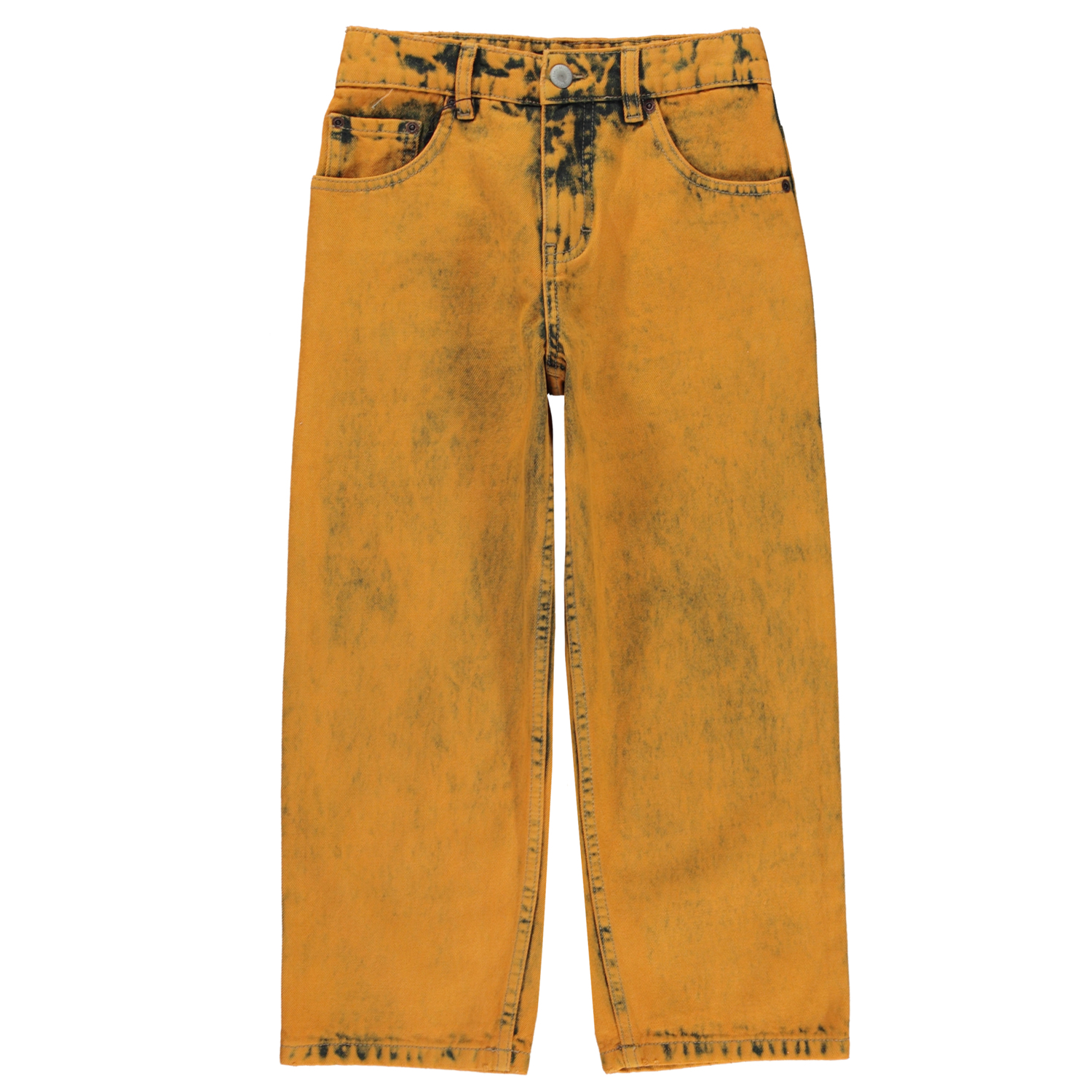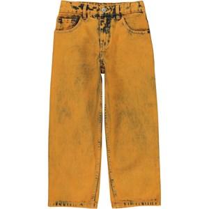 Oranje jeans met een zwart/oranje gemêleerd effect. Het is van 100% katoen met lange pijpen. De jeans heeft een ruimvallende pasvorm. De tailleband kan worden aangepast door middel van een elastiek aan de binnenkant, zodat de jeans perfect past bij alle kinderen. De maten 92-134 hebben een drukknoop, terwijl de maten 140-176 een gewone jeansknoop hebben. Het grootste deel van dit model is gemaakt van biologisch katoen.