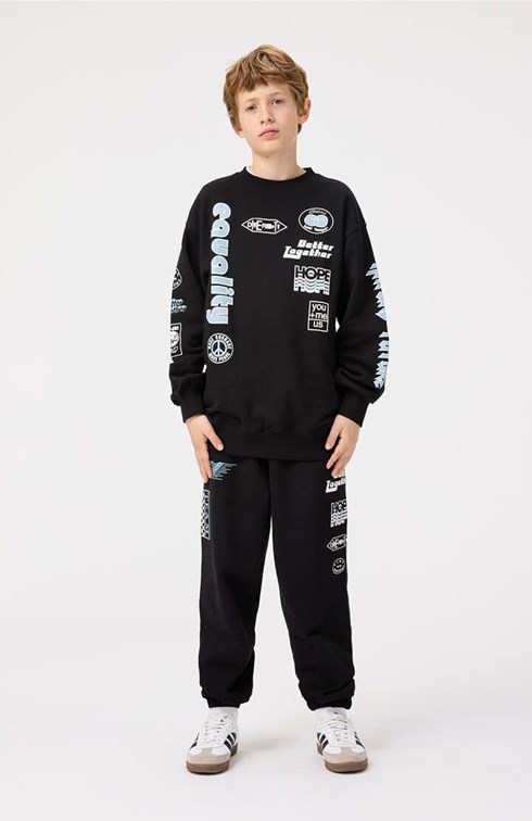 Joggingbroek van biologisch katoen. De broek heeft een verstelbare elastische taille, zijzakken, een enkele achterzak, elastische enkels en een normale pasvorm. Het is zwart met motocross-referenties in de print. Voor een complete outfit combineer je het met de bijpassende sweater.