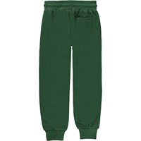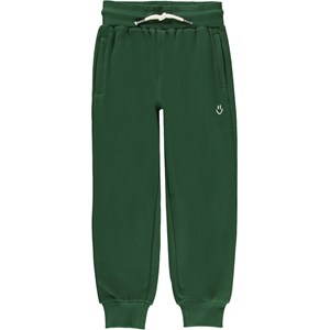 Alvar is een sportieve groene joggingbroek met op de voorzak een print van een kleine smiley. Het heeft een brede elastische boord en zakken met een rits.