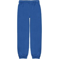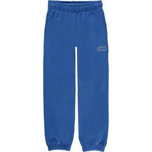 Am is een blauwe unisex joggingbroek met een elastische boord rond de pijpen en taille en een logo patch aan de linkerkant. Het heeft voorzakken en een zakje op de achterkant.