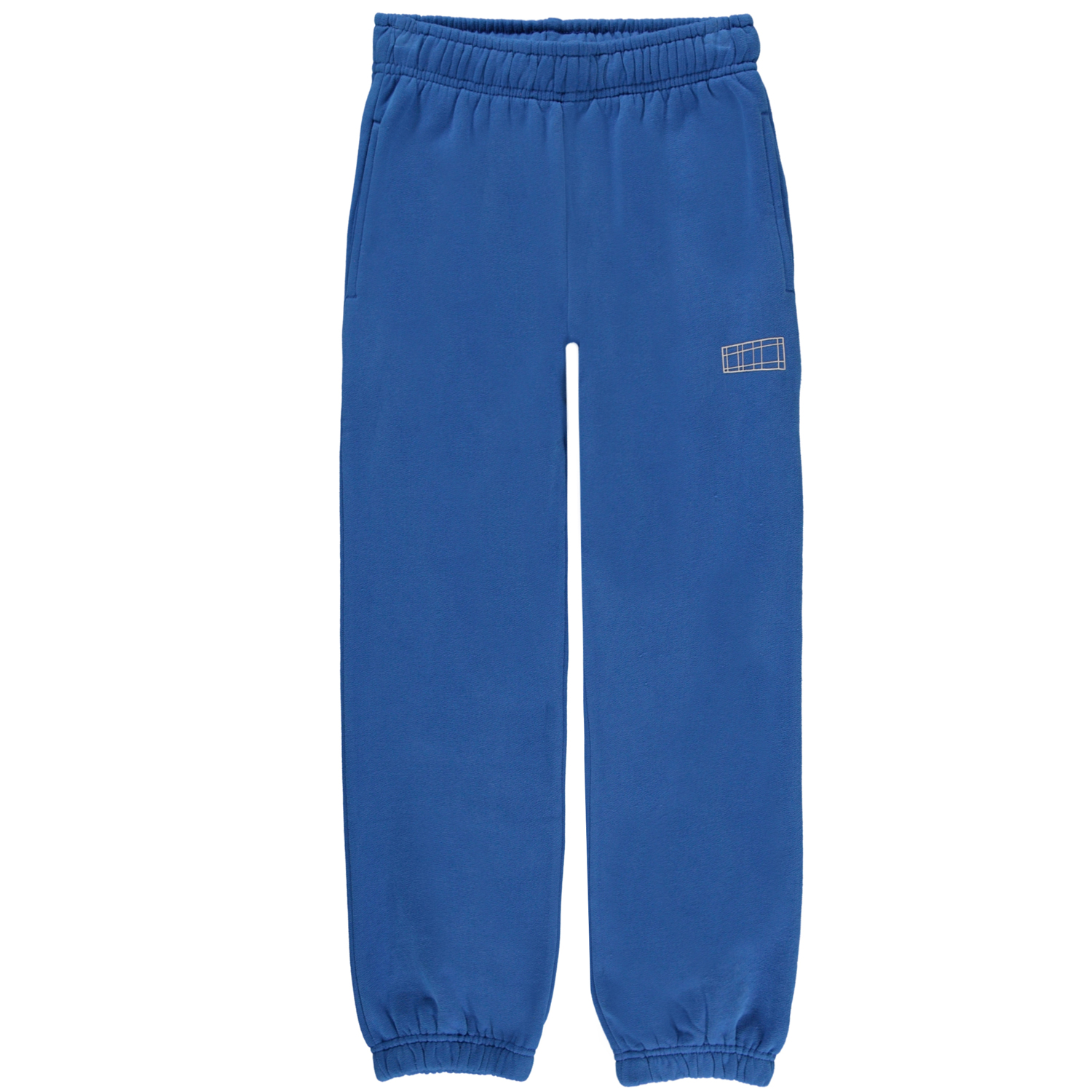 Am is een blauwe unisex joggingbroek met een elastische boord rond de pijpen en taille en een logo patch aan de linkerkant. Het heeft voorzakken en een zakje op de achterkant.