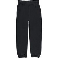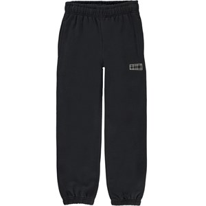 Am is een zwarte unisex joggingbroek met een elastische boord rond de pijpen en taille en een logo patch aan de linkerkant. Het heeft voorzakken en een zakje op de achterkant.
