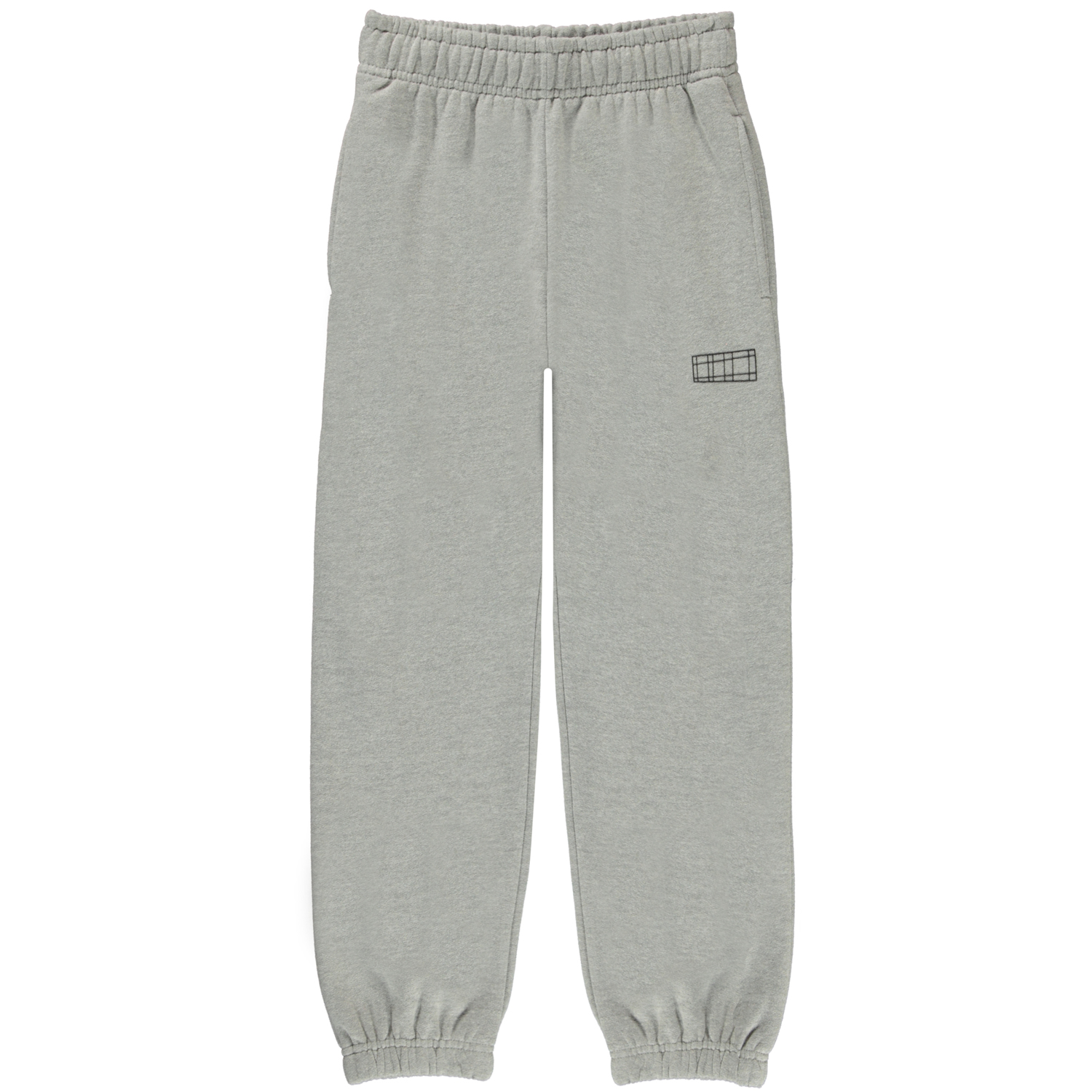Am is een grijze unisex joggingbroek met een elastische boord rond de pijpen en taille en een logo patch aan de linkerkant. Het heeft voorzakken en een zakje op de achterkant.