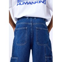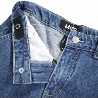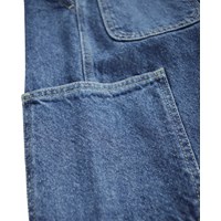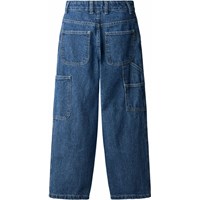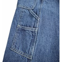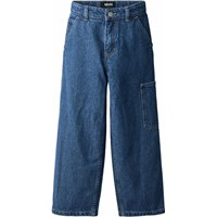 Blauwe katoenen spijkerbroek met werkdetails en zakken aan de zijkanten en langs de pijpen. De taille kan worden aangepast met een interne elastiek voor een optimale pasvorm voor alle kinderen. Maten 92-134 hebben een drukknoop om het gemakkelijk aan en uit te trekken en de maten 140-176 hebben een reguliere jeansknoop.