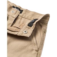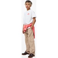 Beige cargobroek gemaakt van zacht katoenen keperstof in een relaxte pasvorm. De broek heeft schuine zakken aan de voorkant, een grote zijzak, riemlussen en een verstelbare taille. De kleinste maten (92-134) hebben een drukknoop en de maten 140-176 hebben een klassieke jeansknoop.