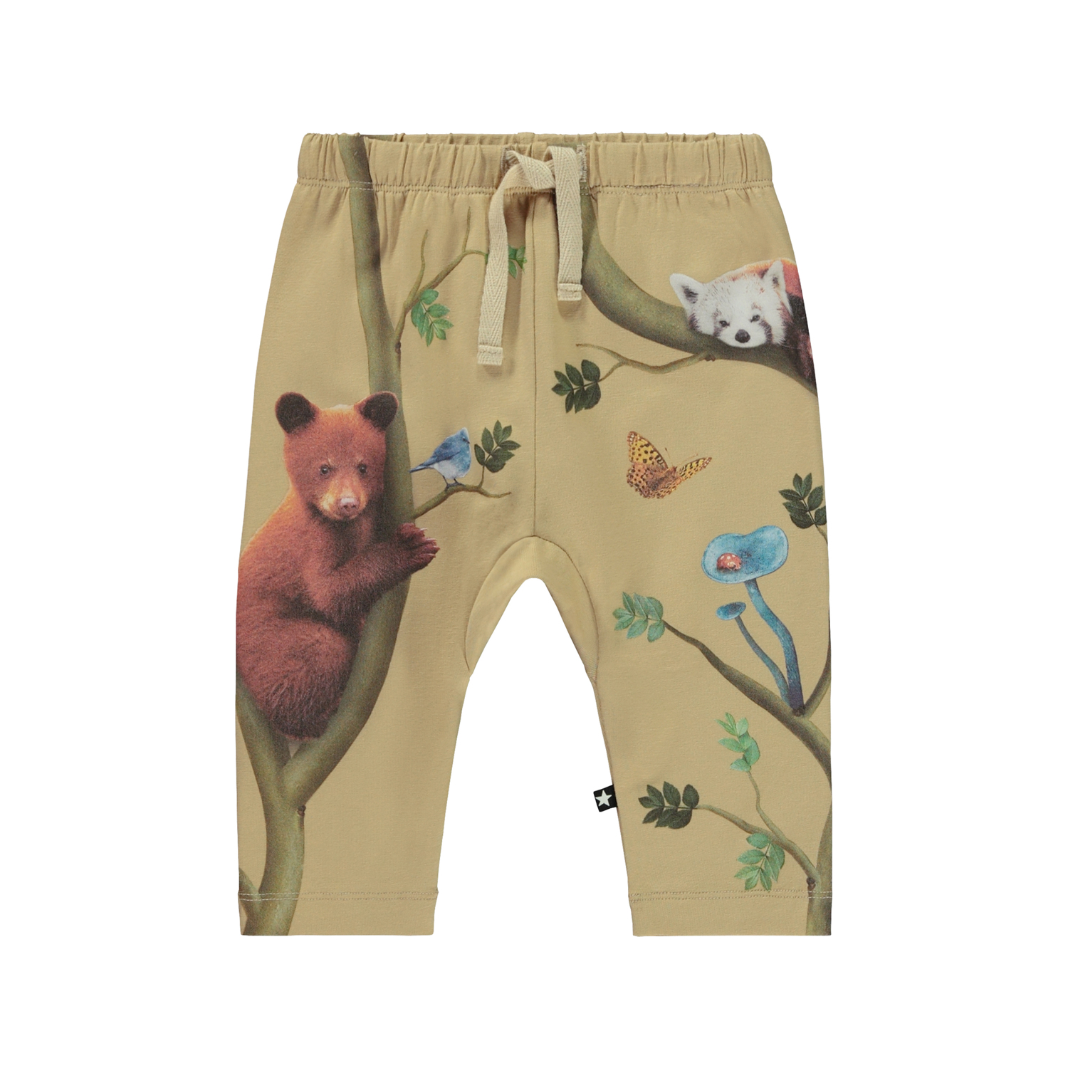 Voor de kleine kinderen een beige broek met een print. Op de print staan vele verschillende dieren in de boom waar bladeren en paddenstoelen op groeien. Deze broek is van 100% katoen en heeft koordjes in de taille. Draag het met de Eloy longsleeve die de "Rabbit Life” print heeft.