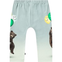Lichtblauwe broek van biologisch katoenen jersey voor baby's en peuters. De broek heeft een ruimvallende pasvorm en een elastische taille, waardoor het gemakkelijk aan en uit te trekken is en bewegingsvrijheid biedt. De broek heeft een print van kleine beertjes die spelen met kleurrijke ballonnen.