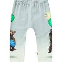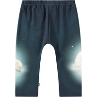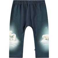Donkerblauwe broek van biologisch katoenen jersey voor baby's en peuters. De broek heeft een ruimvallende pasvorm en een elastische taille, waardoor het gemakkelijk aan en uit te trekken is en bewegingsvrijheid biedt. De broek heeft een print van spelende ijsbeertjes onder een sterrenhemel.