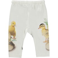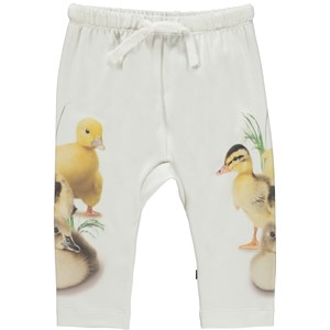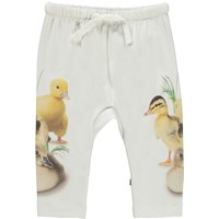 Sabb is een ruimvallende witte babybroek met een lieve print van gele eendjes. Het heeft koordjes in de taille.