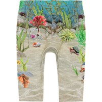 Voor kleine kinderen een zandkleurige broek van biologische katoenen jersey met print. Het heeft een ruimvallende pasvorm en een elastische taille met koordje voor een fijne en comfortabele pasvorm. De broek heeft een kleurrijke print van de bodem van de oceaan met krabben, zeesterren en prachtige wuivende zeeplanten.