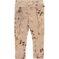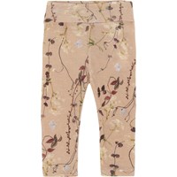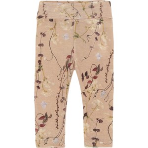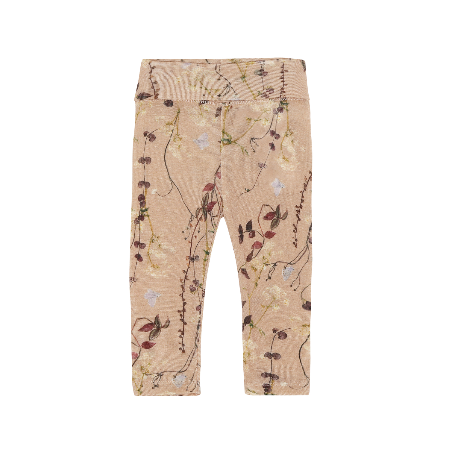 Sabi is een lichtroze Merino wollen babybroek met een print van bloemenslingers. De broek plooit in de taille.
