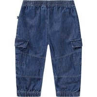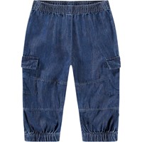 Blauwe cargobroek van zacht biologisch katoen chambray voor baby's en peuters. De broek heeft een ruimvallende pasvorm en cargozakken op de bovenbenen. Het heeft ook een elastische taille, waardoor het gemakkelijk aan en uit te trekken is, evenals een elastische boord rond de enkels.