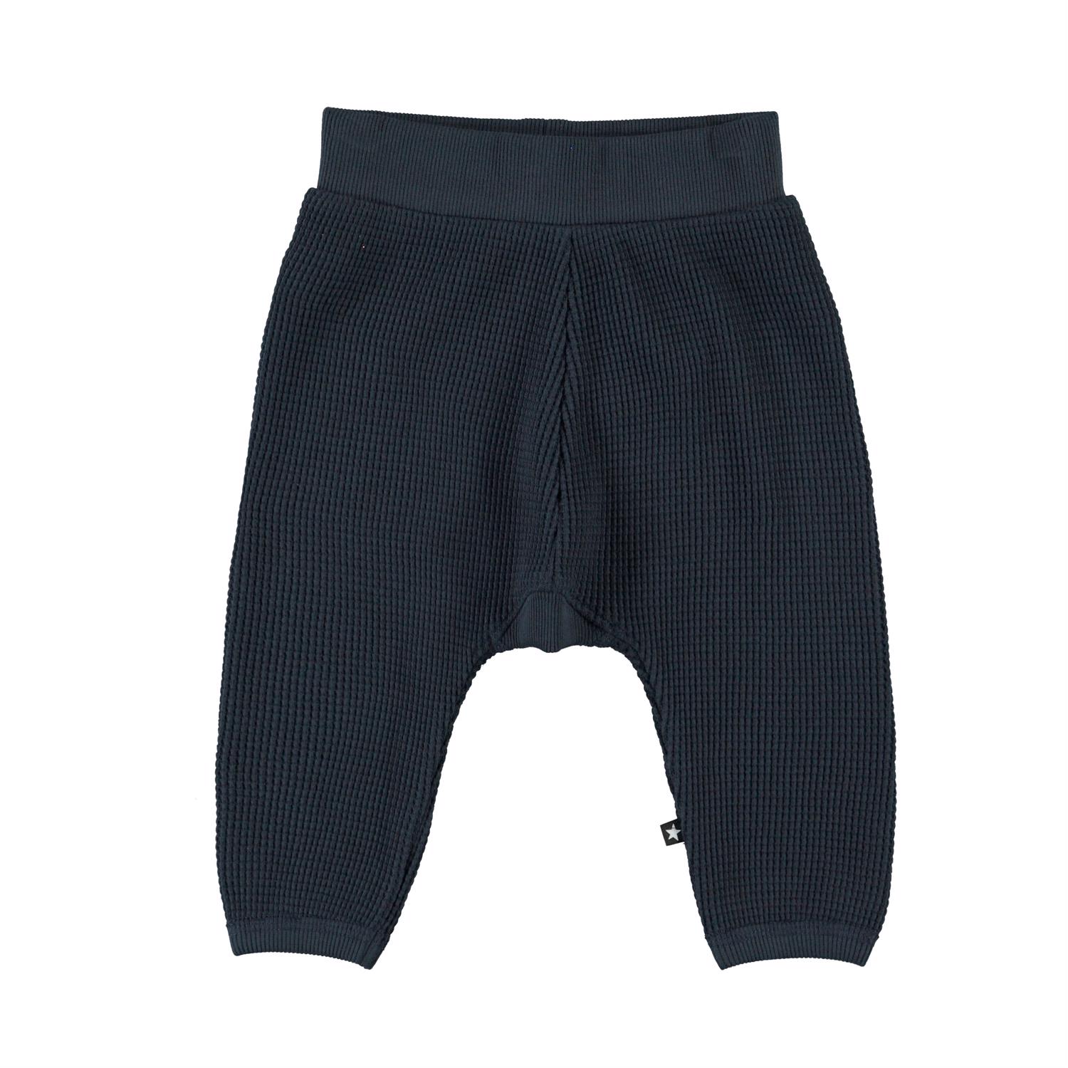 Samantha is een donkerblauwe babybroek van gewafeld biologisch katoen. Het heeft een elastische tailleband voor een comfortabele pasvorm.