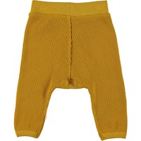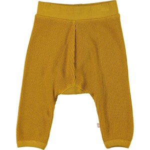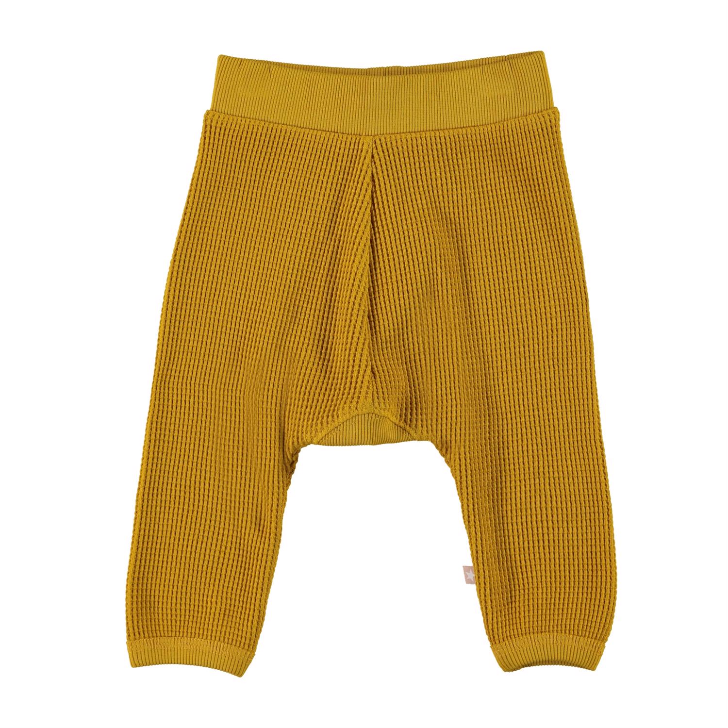 Samantha is een gele babybroek van gewafeld biologisch katoen. Het heeft een elastische tailleband voor een comfortabele pasvorm.