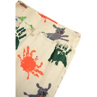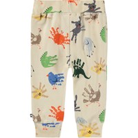 Beige broek voor de kleintjes gemaakt van zachte biologische katoenen jersey met een print van kleurrijke handafdrukken die op dieren lijken. De broek heeft een brede elastische ribboord rond de taille en pijpen zodat het comfortabel draagt en veel bewegingsvrijheid biedt.